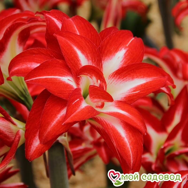 Крупные ( до 24 см в диаметре) махровые цветки на цветоносе высотой 50-60 см. Цвет красный с белыми полосками в центре. Месторасположение: яркий рассеянный свет. Почва: свежая, богатая питательными веществами. Посадка: весной, горшок подбирают в соответствии с размером луковицы: расстояние между ней и стенками горшка должно быть не более 3 см. Луковицу при посадке заглубляют на половину от её высоты. Уход: летом обильный полив и регулярные подкормки. Осенью полив уменьшают, после отмирания листьев прекращают совсем. Зимой растения содержат при температуре 16 °С. Пересаживают примерно раз в 3 года в период покоя. Использование: для горшечной культуры, а также на срезку.